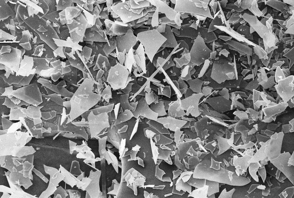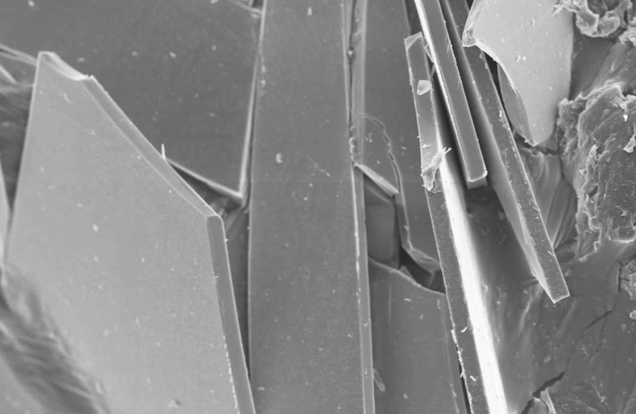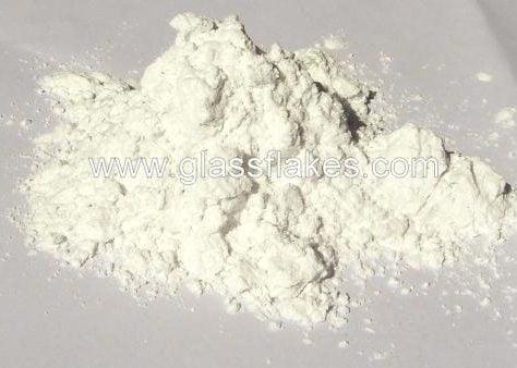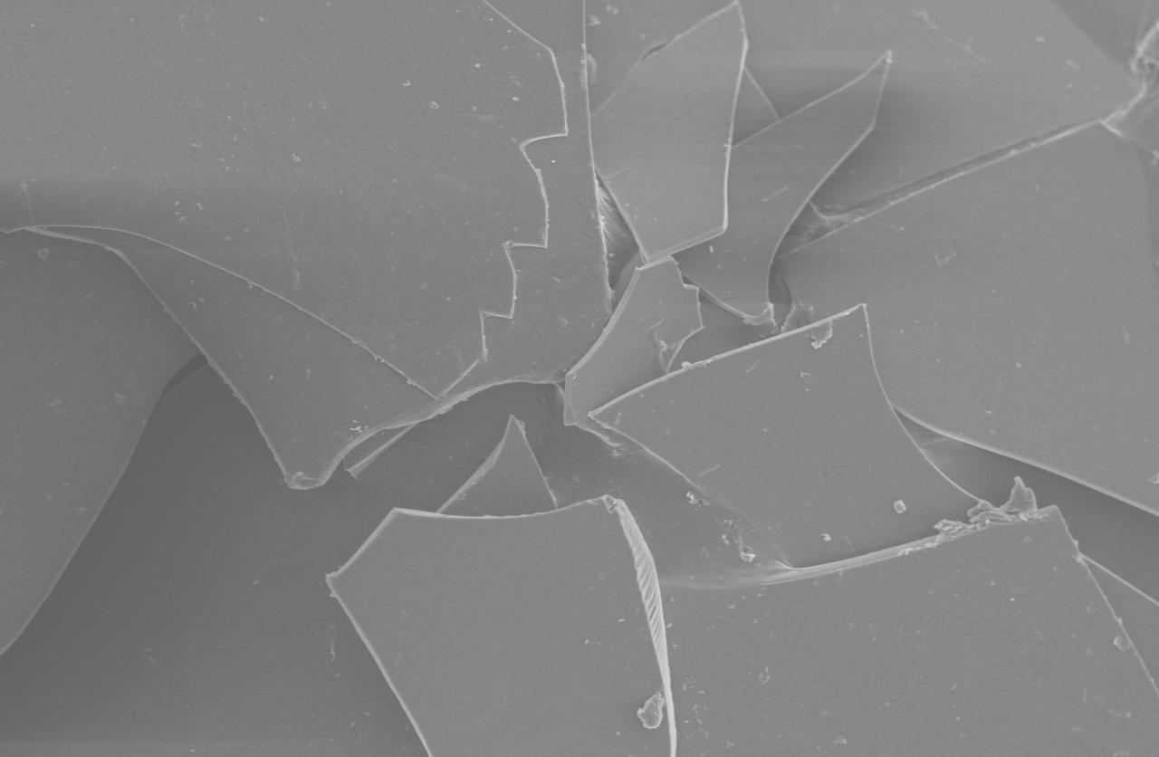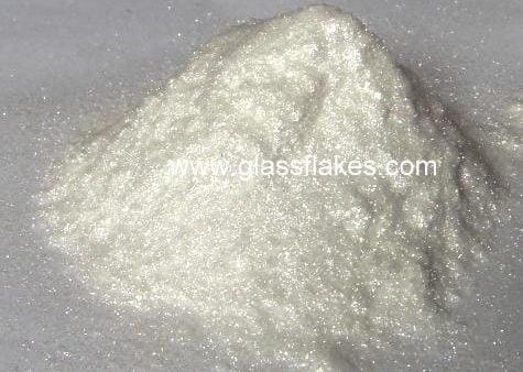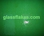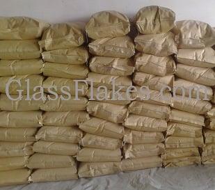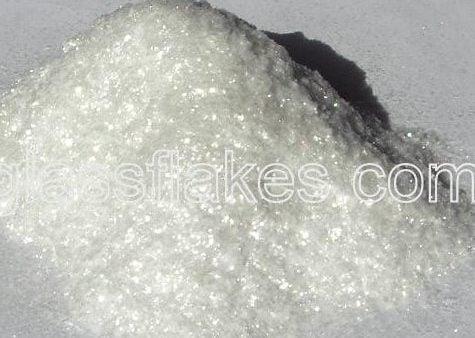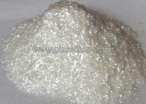 Close-up showing irregular platelet morphology and smooth fractured surfaces typical of milled C-glass flakes.